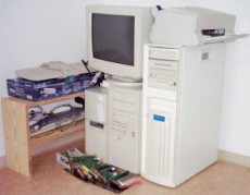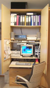 ![]() | Auch außerhalb von Job und Studium interessiere ich mich für (fast) alles rund um die Rechentechnik. Der zugehörige Arbeitsplatz im Schlafzimmerschrank (sponsored by Finanzamt) begrenzt das Chaos. Für das Studium bietet er jedoch nicht genug Platz. |